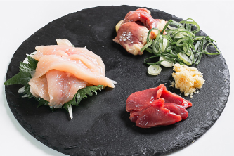 鶏のお造りをゴマ油や醤油につけて食べるその食感は絶品!柔らかな鶏造りの三種盛りはお子様から年代問わず幅広く大人気! -